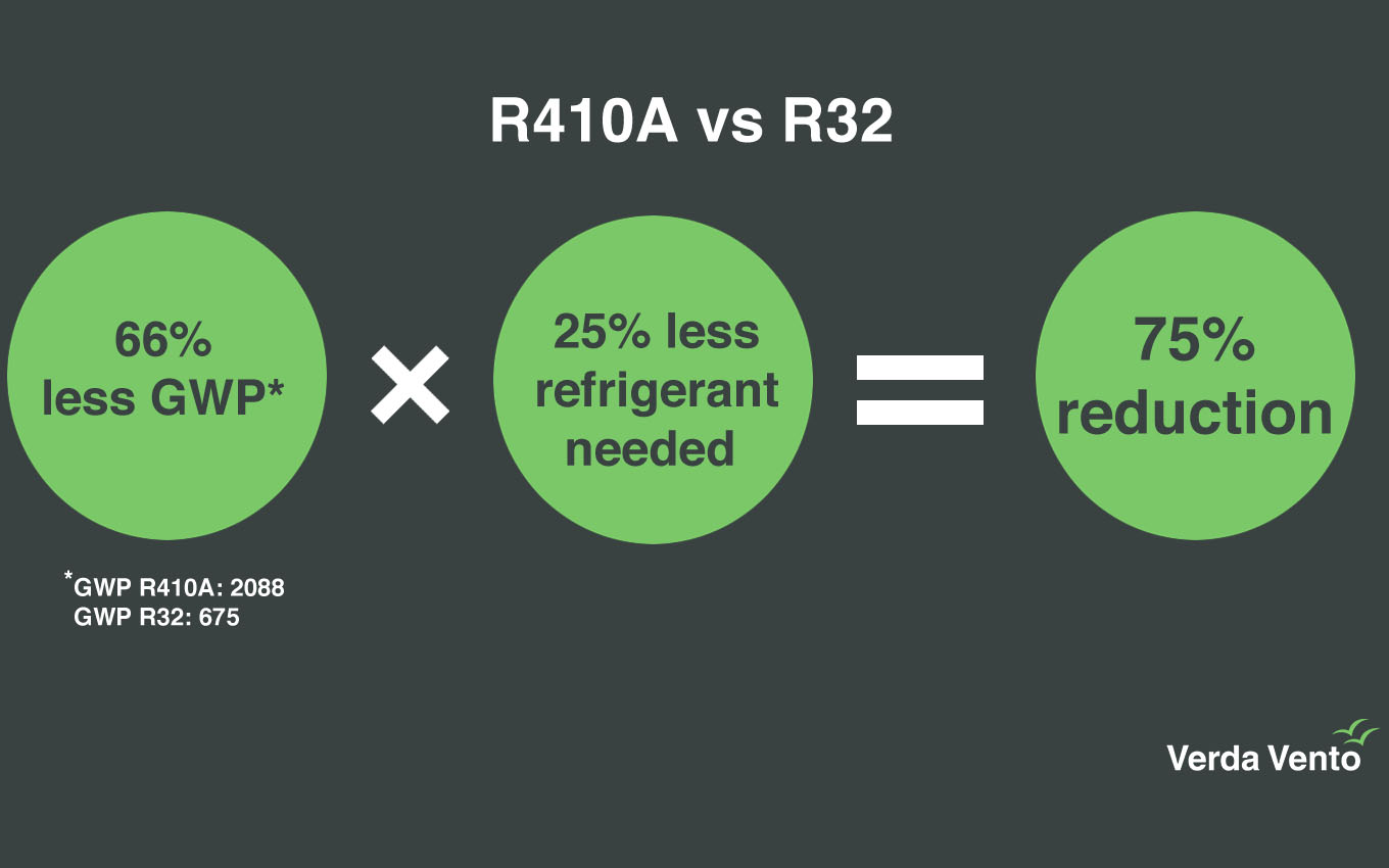 (Visual comparisons: R32 brings ~66–75% effective GWP reduction when switching from R410A systems.)